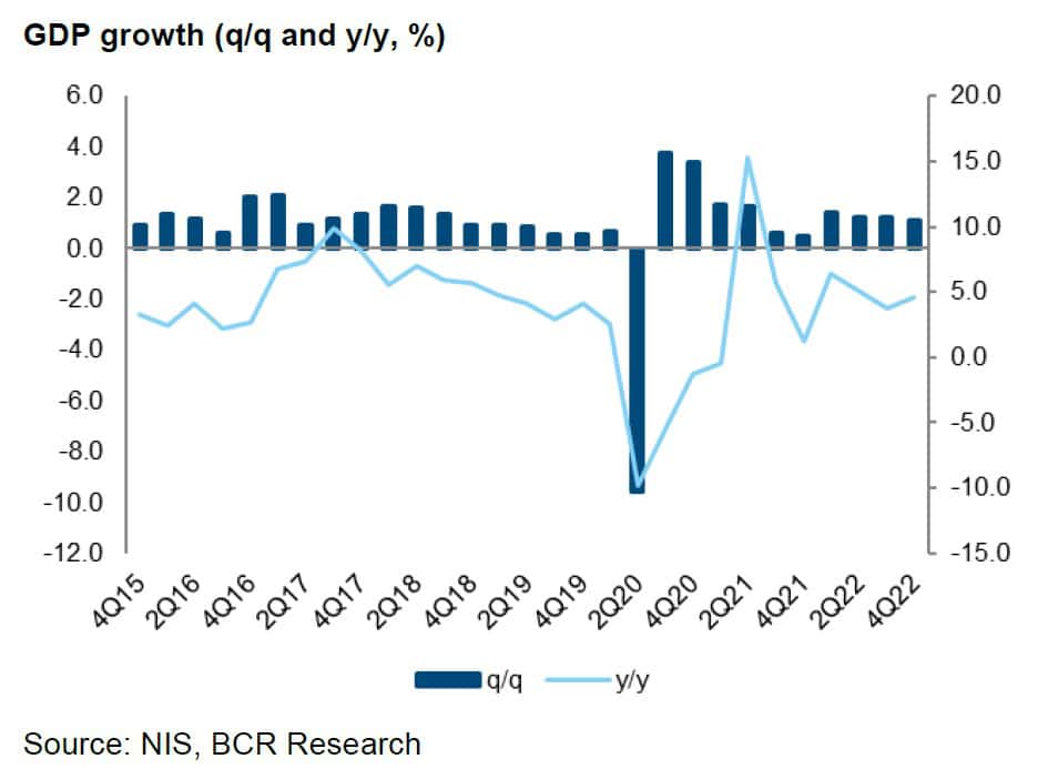 Producția industrială a scăzut în ultimele trei luni din 2022 cu 2,1% față de trimestrul anterior, încheind anul cu o corecție de 2,0% față de 2021. Vânzările cu amănuntul au crescut cu 0,8% în T4 și au încheiat întregul an cu o creștere de 4,4%, în timp ce lucrările de construcții au crescut cu 8,1% în primele două luni ale trimestrului IV față de trimestrul III. Indicele de sentiment economic (ESI) a crescut la 103 de la 101,5 în trimestrul al treilea.
