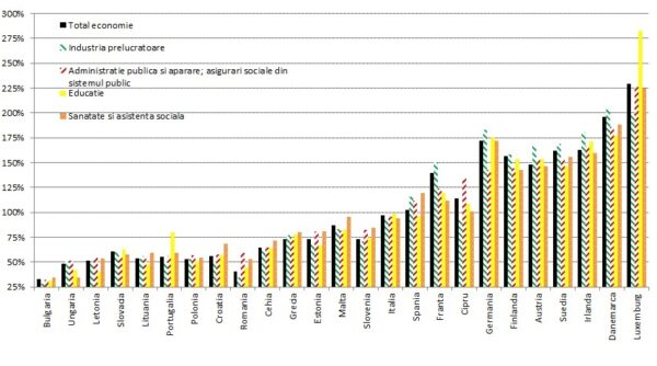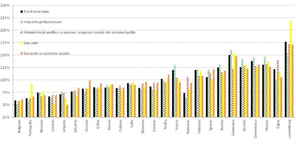 Graficul de mai jos reprezintă salariile medii la diverse feluri de salariați bugetari, raportate la salariul mediu din industria prelucrătoare a fiecărei țări.
