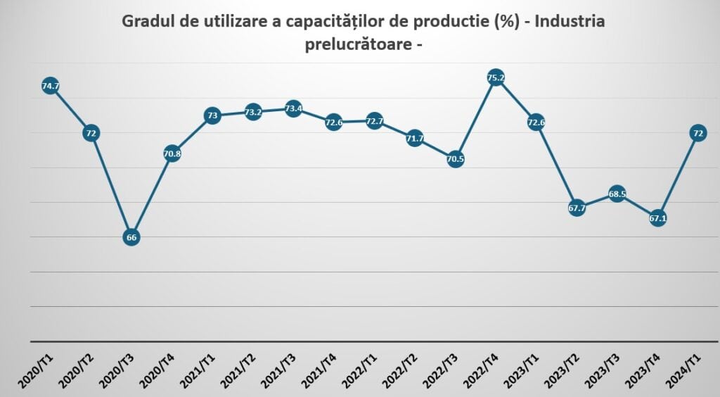 Se observă în 2023 o scădere pronunțată a gradului de utilizare a capacităților de producție în ramurile industriale manufacturiere, care furnizează cea mai mare parte a exporturilor apropape de nivelul atins în 2020, în pandemie. Această scădere din 2023 a gradului de utilizare a capacităților de producție corespunde unei reduceri de 4,6% a industriei prelucrătoare și unei scăderi medii de -2,5% în UE