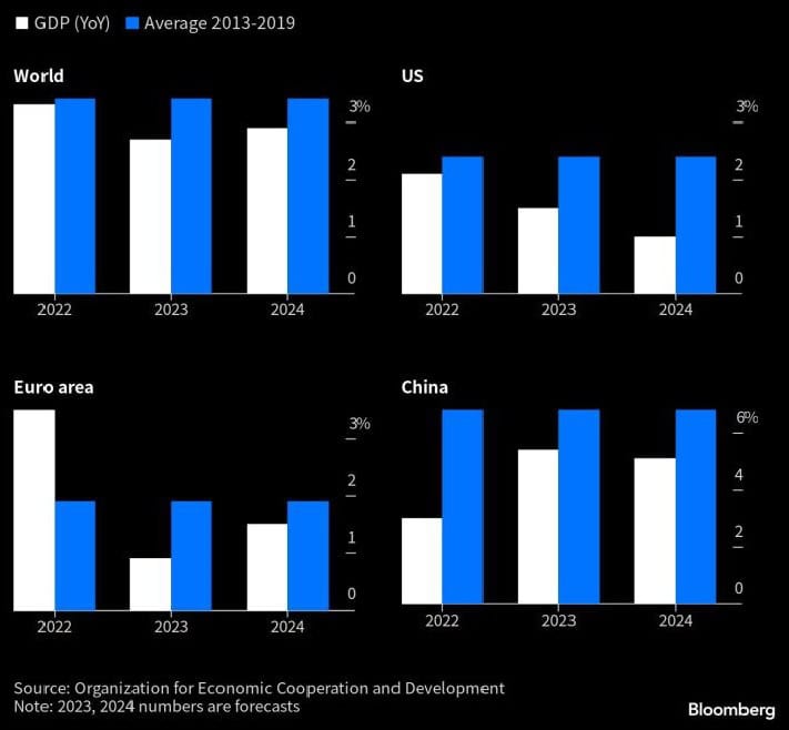 În cel mai recent raport Economic Outkook al organizației cu sediul la Paris se prognozează o expansiune de 2,7% a PIB-ului global în acest an și o creștere modestă de 2,9% în 2024, amândouă valori sub media ultimilor 7 ani de dinainte de pandemie.