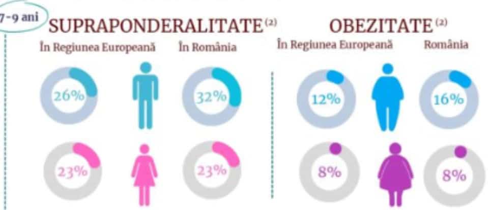 În România, media prevalenţei supraponderalităţii în rândul copiilor din ciclul primar (cu vârsta cuprinsă între 7 și 9 ani) este 28%, iar a obezităţii 12%, conform datelor publicate de OMS.
