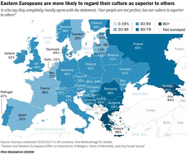 Analiza datelor arată că există un pattern în estul Europei, ce reflectă un șovinism cultural manifestat în statele mici și mai sărace – Grecia, Georgia, Armenia, Bulgaria, Bosnia, Românaiași Serbia. Rusia apare și ea, dar face excepție, din mai multe puncte de vedere – este și un stat foarte puternic și are și o cultură deosebită.
