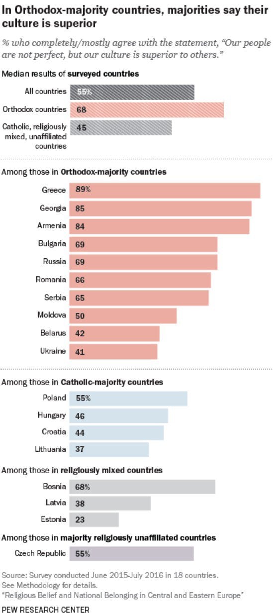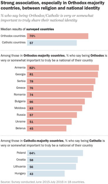 În țările ortodoxe din fostul bloc comunist există o asociere mult mai puternică între religie și identitatea națională, iar populația majoritară este mai înclinată să creadă că aparține unei culturi superioare, comparativ cu statele preponderent catolice, potrivit unui amplu studiu Pew Research Center.