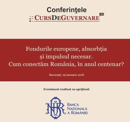 CursDeGuvernare.ro, organizează luni, 29 ianuarie, cu sprijinul Băncii Naționale a României, conferința ”Fondurile europene, absorbția și impulsul necesar. Cum conectăm România, în anul centenar?” La