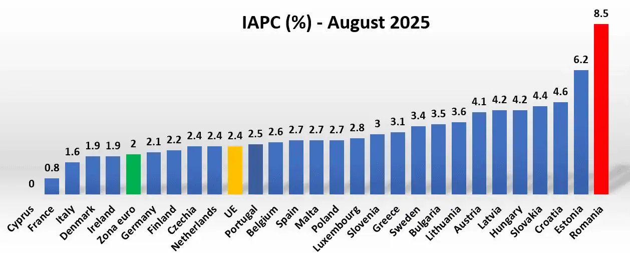 Rata anuală a inflației în Uniunea Europeană a rămas stabilă în luna august la 2,4%, iar România este în continuare țara cu cea mai ridicată