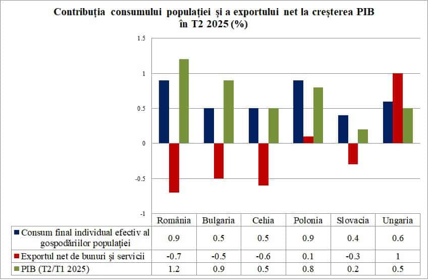 Spre deosebire de România, în statele din regiune consumul guvernamental a contribuit pozitiv, alături de consumul privat la creșterea PIB în T2/2025. În România,